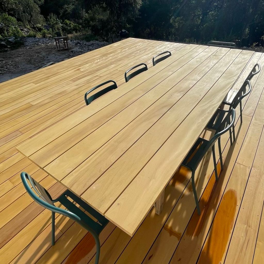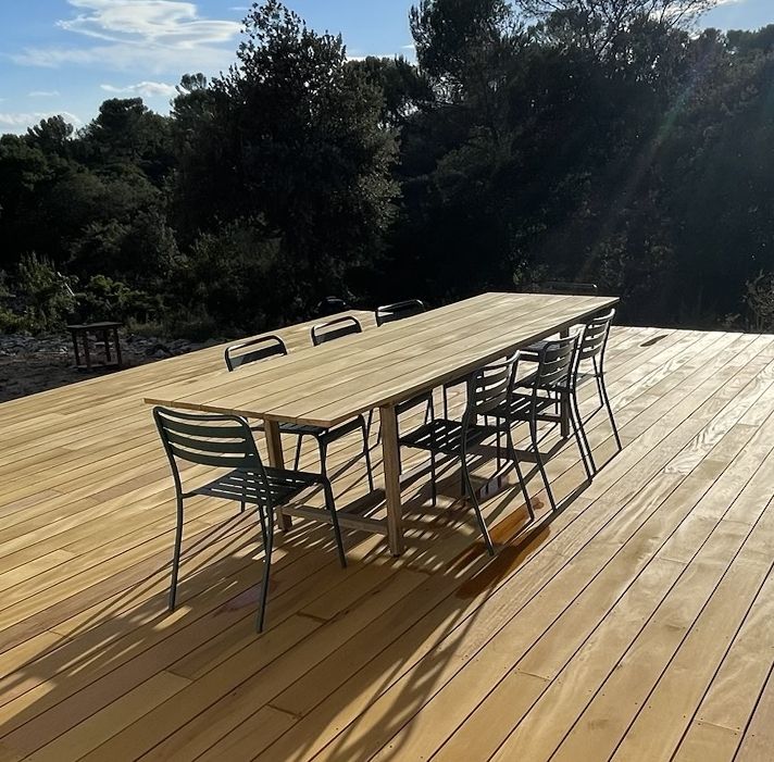 Table en Garapa de 2400mm de long x 900mm de large, réalisée à partir de lames de terrasse. Pied de table réalisé avec des lambourdes 40x60mm. Mini pieds réglables en gomme pour un maximum de stabilité. La réalisation de cette table dans la même essence de bois que la terrasse rend l’ensemble harmonieux. Possibilité de réaliser ce type de table dans l’essence de bois souhaitée. Devis sur demande